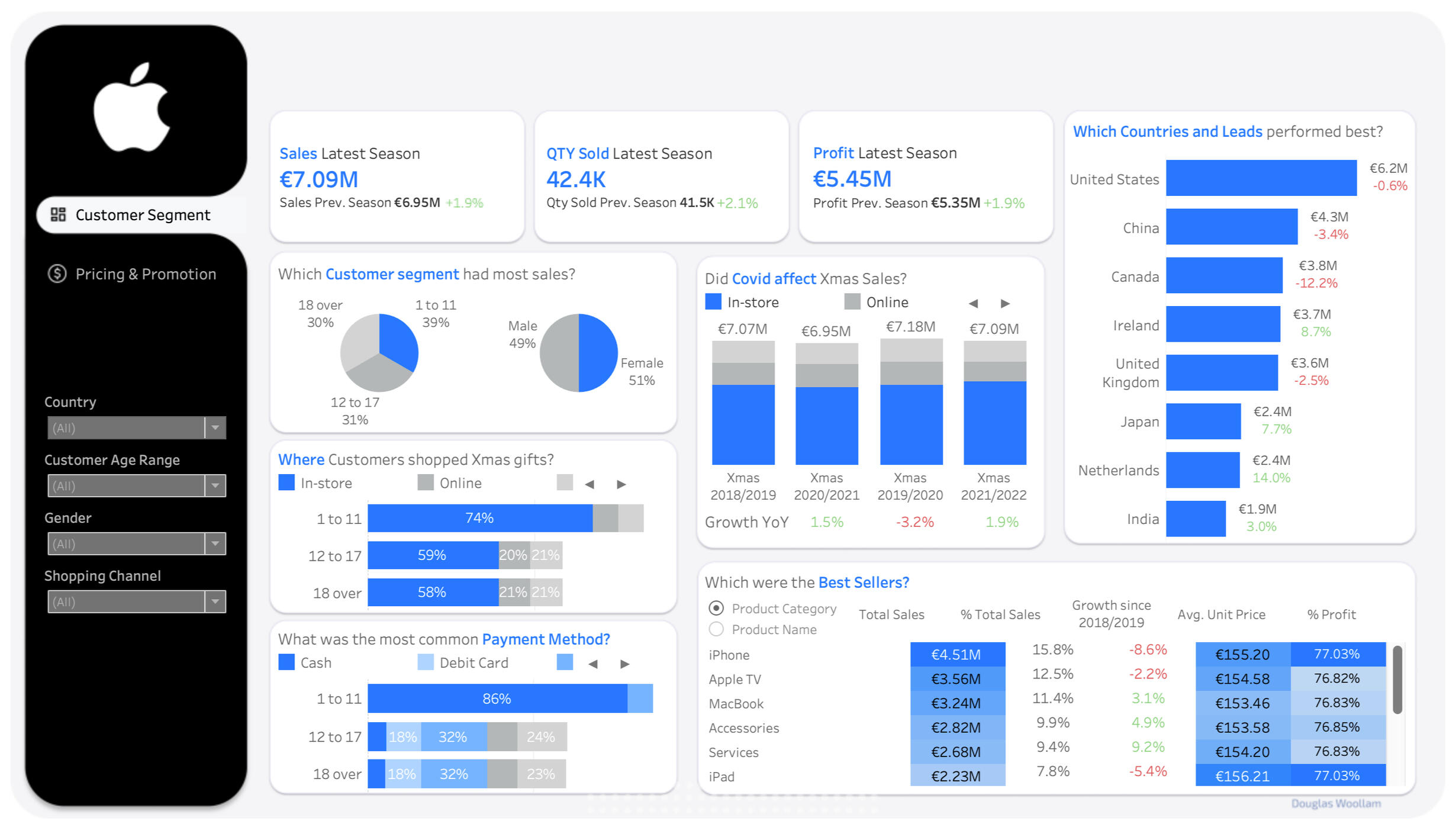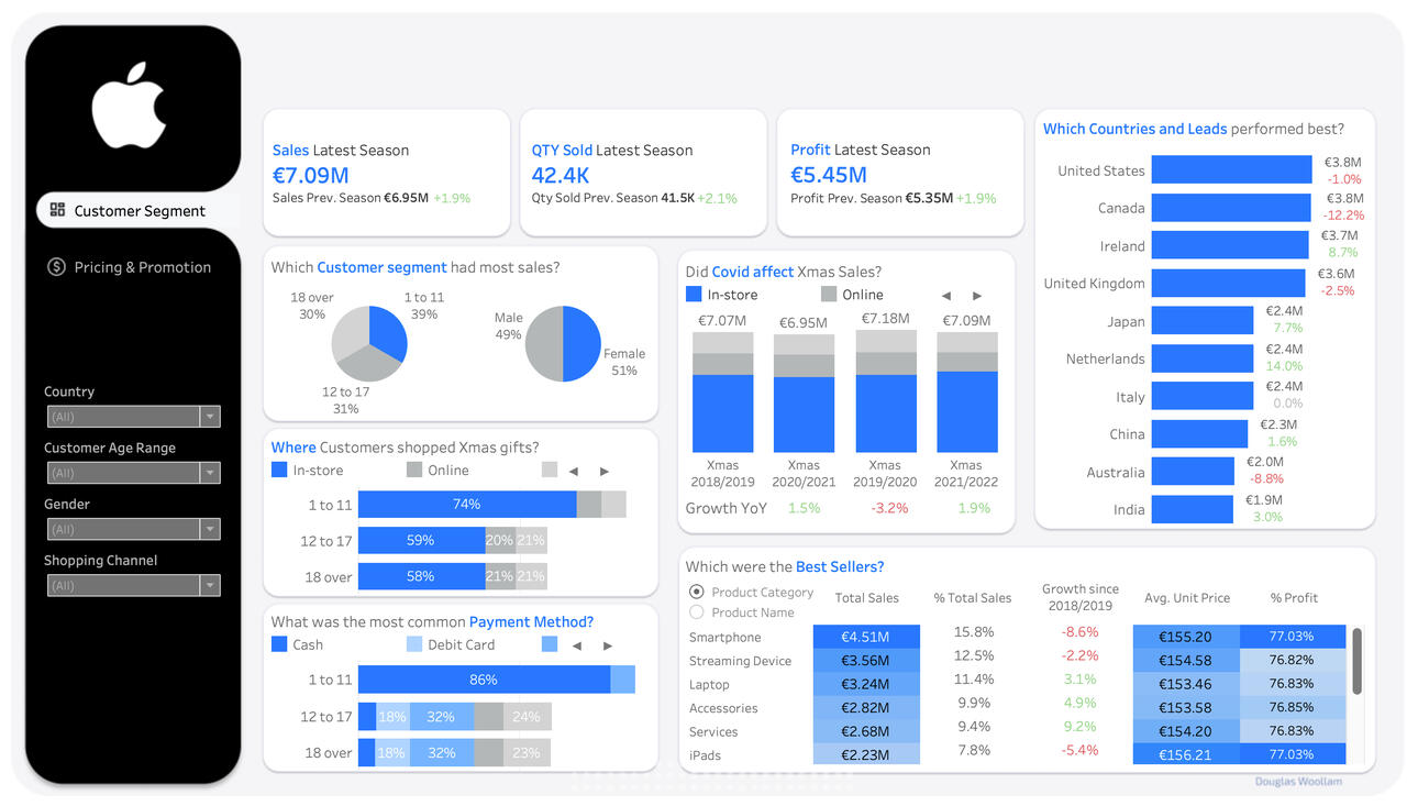 Here are my key takeaways:1) Children (ages 1–11) contributed nearly 40% of total Christmas sales, with Smartphones and in-store shopping being their top preferences.2) The top 5 best-selling products, all for children, declined by up to 15% over four years — highlighting changing consumer trends.3) United States led with €6.2M in sales and US Apple Stores leading with €2.5M in sales, while Netherlands grew 14%, and Canada declined by 12% since 2018/2019. Irish Store Select (Compu B) increased sales by 19.3%, which could be targeted for future sales leads.4) Covid caused a -3.2% dip in 2020, followed by a +1.9% recovery in 2021, though sales hadn’t fully rebounded.5) Customers tend to buy 1–5 products per transaction, but when making bulk purchases, they preferred 5, 10, 15, or even 30 items. This suggests an opportunity for special pricing on bulk purchases to encourage upselling.6) December accounted for 77% of in-store sales, showing a strong opportunity for seasonal promotions. Shopping timing varied — females preferred Sundays and Mondays, while males leaned towards Thursdays for gift buying.