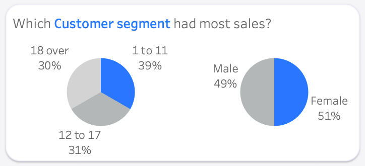 Customer Segment tab:This tab helped answer the questions on Customer Segments, Best Performing Products, Geography, and Covid. It revealed that Children (ages 1–11) contributed nearly 40% of sales, highlighted the decline of top-performing products, mapped regional performance, and showed how sales dipped during the pandemic.