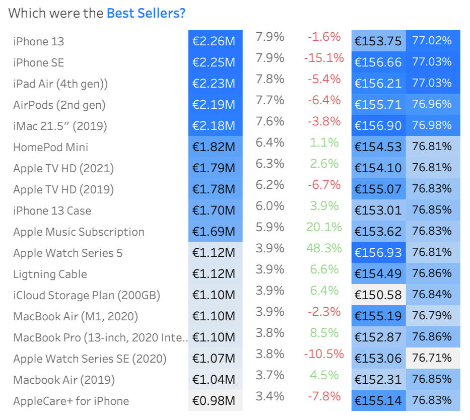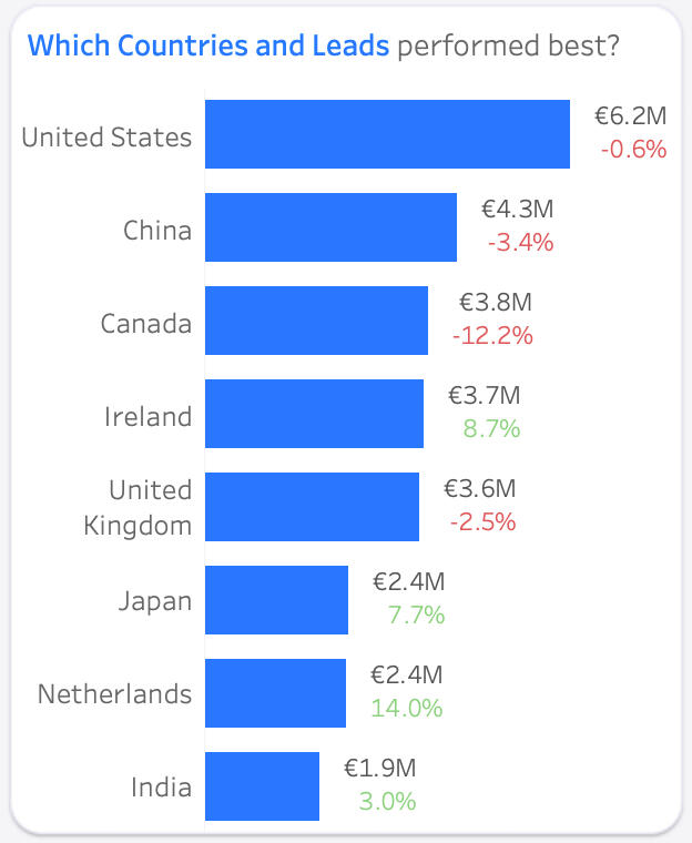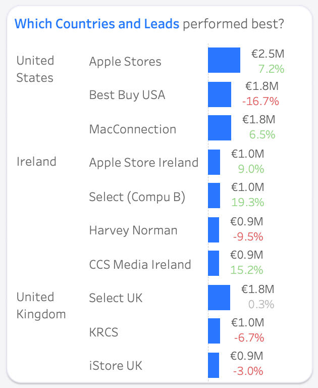 United States took the crown for the most Christmas sales over the four seasons, reaching €6.2 million. Canada, once the best in Xmas 2018/2019, faced a decline of -12% over the four seasons. The Netherlands showcased the most significant growth of 14%, climbing from the 7th to the 5th spot.Drilling down to the Sales Leads, the three Stores in United States (Apple Stores, Best Buy USA & MacConnection) emerged as the top-selling Stores, each generating over €1.8 million in sales.In Ireland, Apple Store Ireland & Select (Compu B) emerged as the top-selling Stores, each generating over €0.9 million in sales.