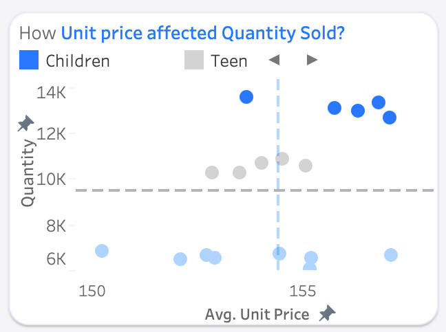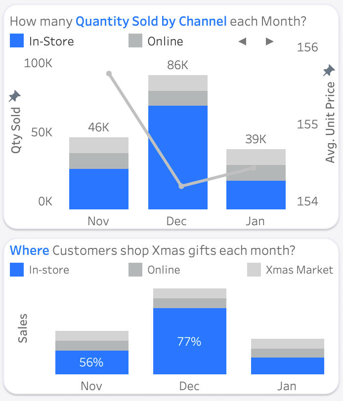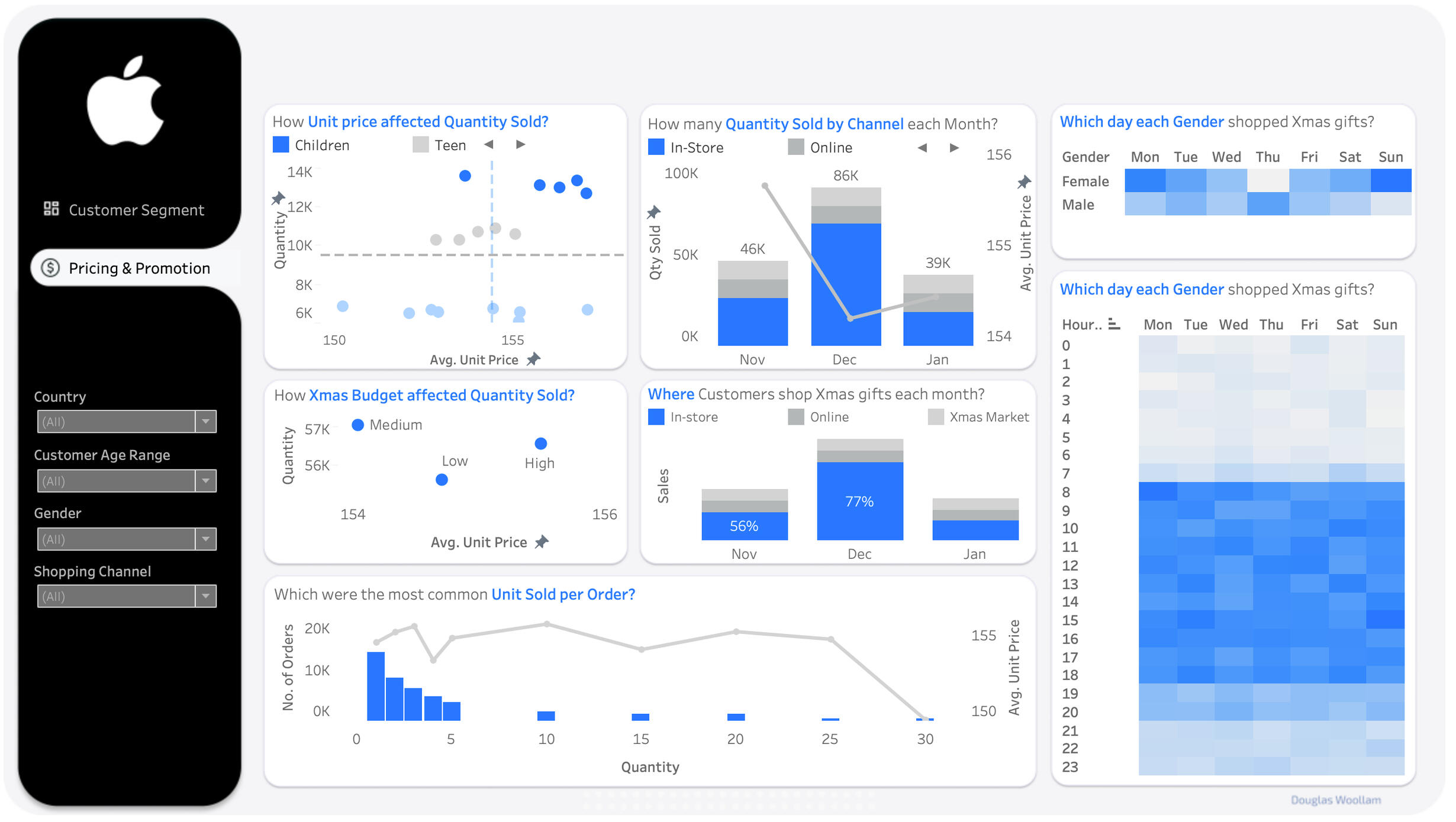 Pricing & Promotion tab:This tab helped answer the questions on Pricing and Shopping Timing. It analyzed how price variation affected sales, identified bulk promotion opportunities, and pinpointed December’s 77% in-store sales share as the key window for promotions.