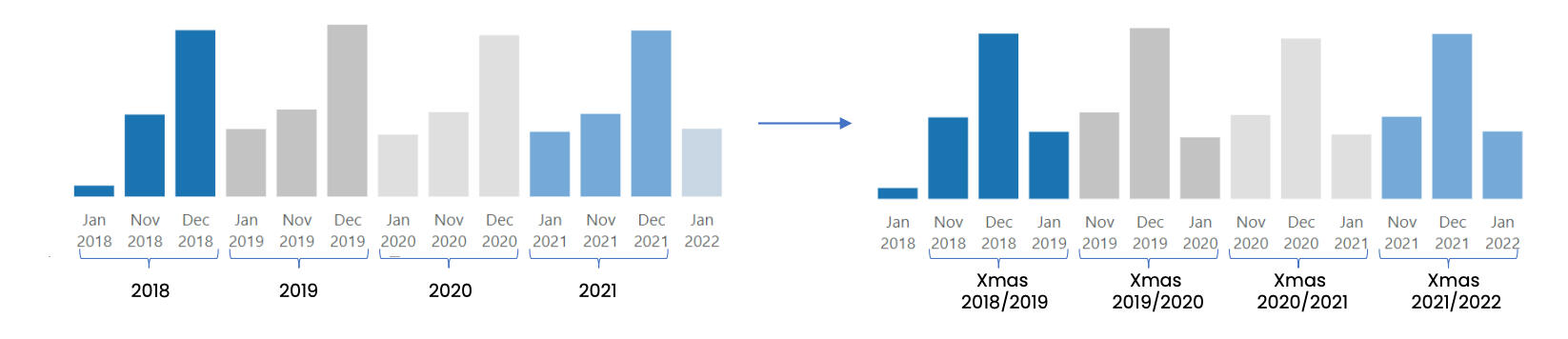 Data CleaningInstead of looking at the data by calendar year, data was grouped into Christmas Seasons to get a better understanding. For example, November 2018, December 2018, and January 2019 are combined into Xmas 2018/2019, considering these three months as one season for retailers and shoppers alike.