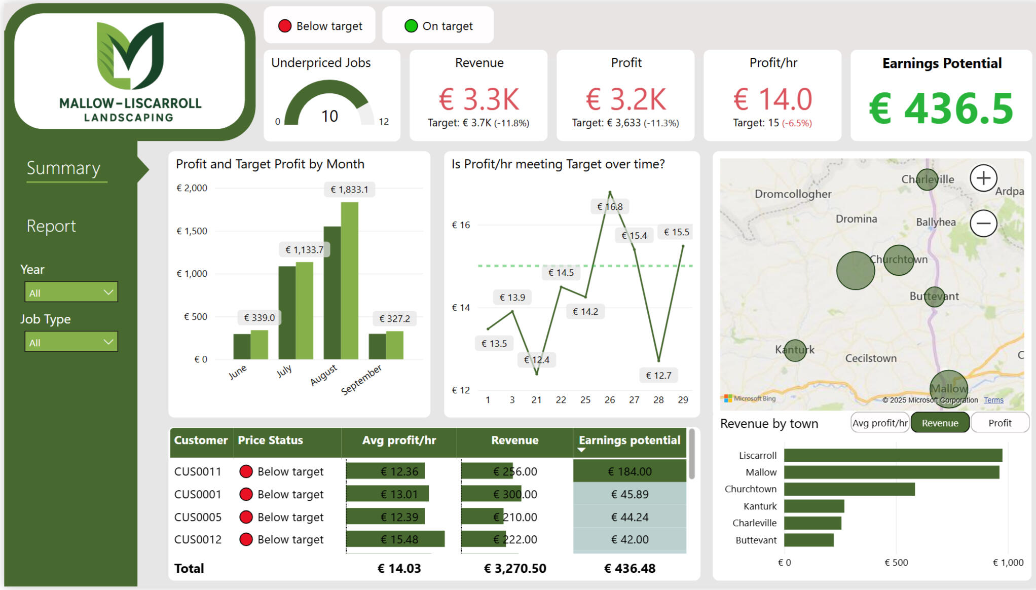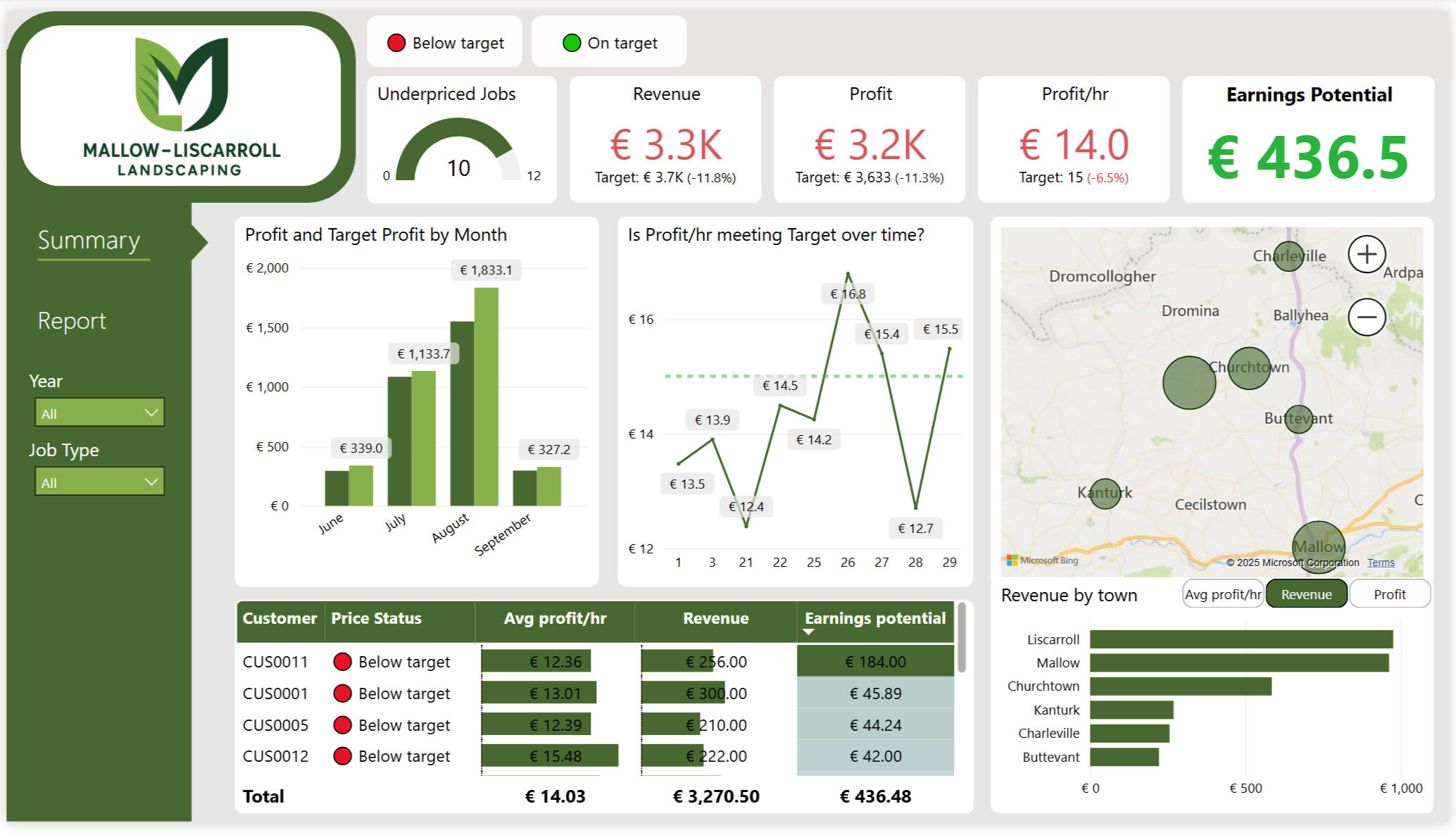 Made for Mallow - Liscarroll Landscaping in my role as a Data Analyst. Recreated with artificial data.I built the a BI stack for a landscaping business I co-founded.