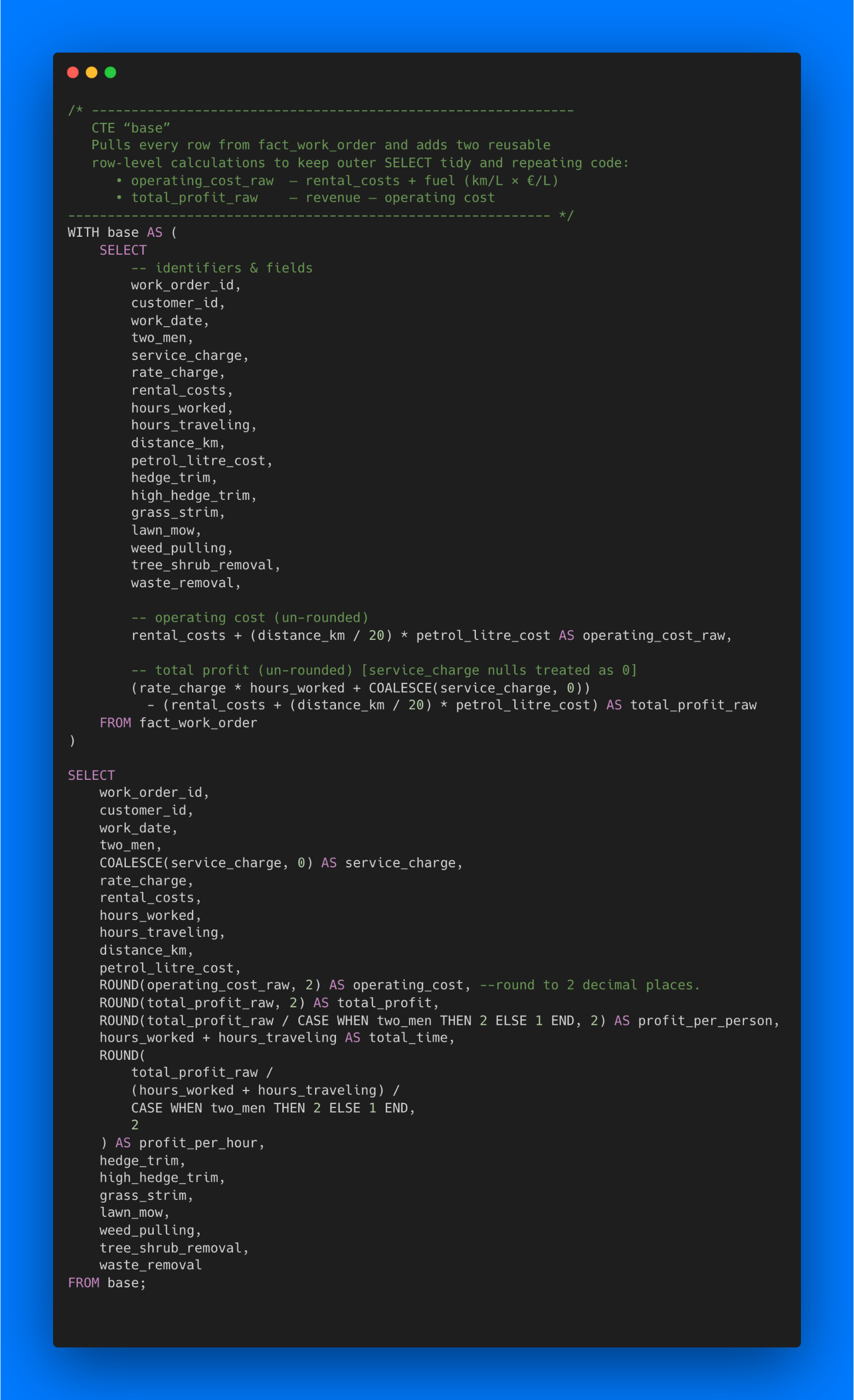 170 line SQL script used to Build tables from the CSV files. Defines keys and data types, NULL/ empty value handling. CTE for dashborad metrics.View SQL Script on my GithubBelow is the base CTE on fact_work_order, normalises service_charge nulls to 0, rounds to two decimals, and outputs dashboard metrics: operating_cost, total_profit, profit_per_person, total_time, and profit_per_hour.184660545