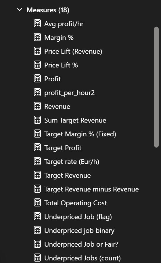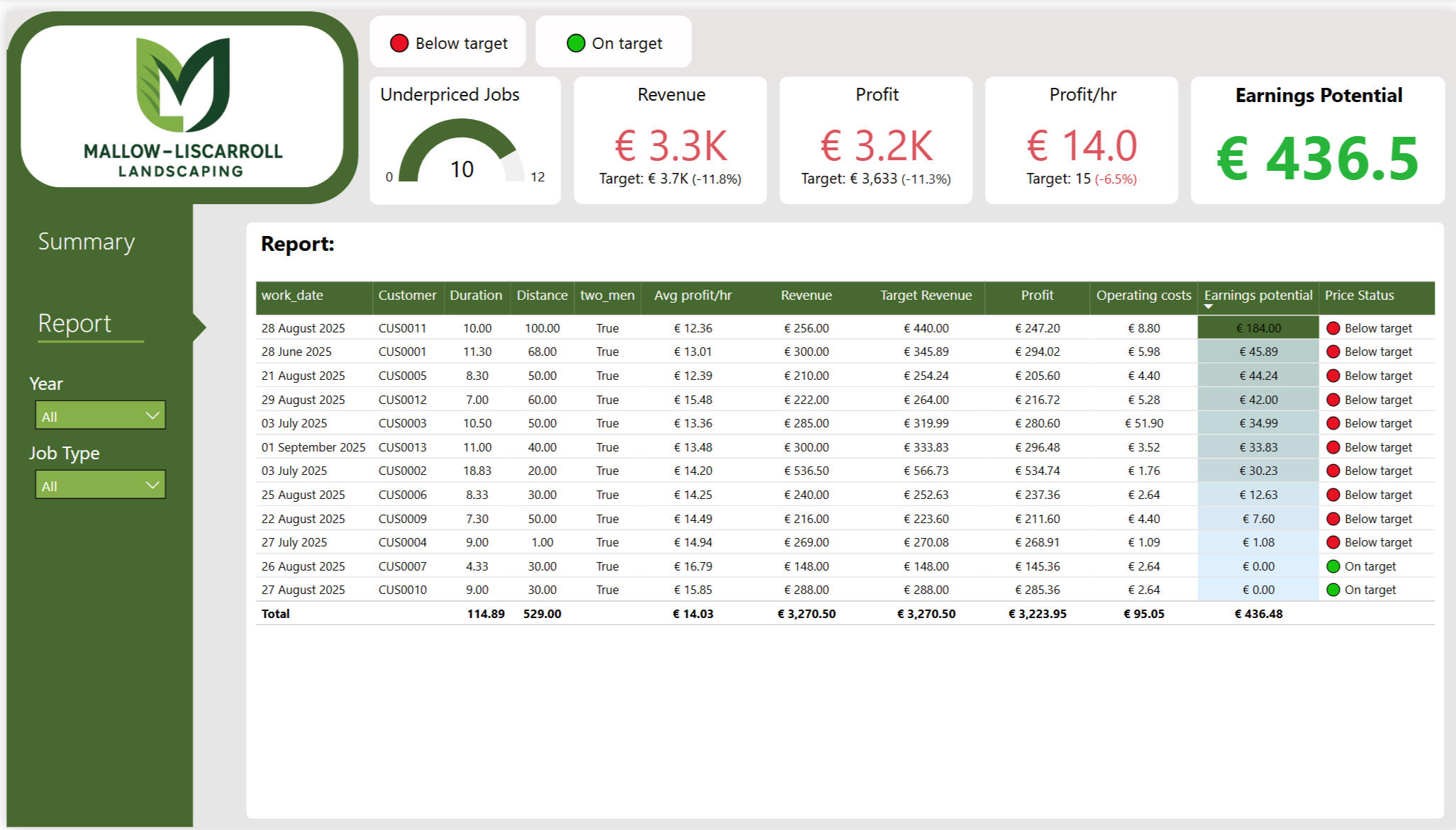 Report tab:The report page presents a job level table with key metrics such as work date, customer, duration, distance, crew size, revenue, profit, profit per hour, operating costs, target revenue, earnings potential, and price status. All slicers are synced with the summary page.