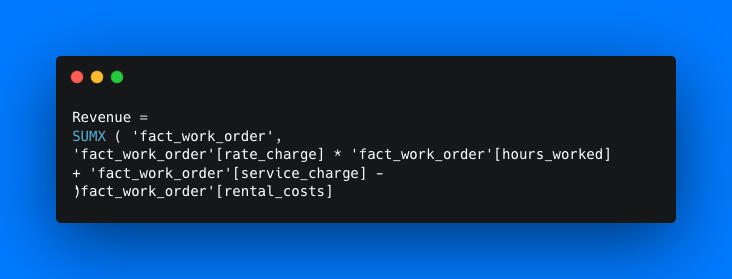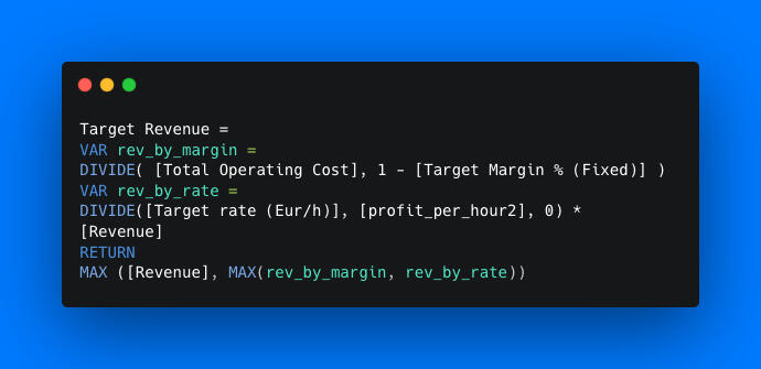 18 DAX measures were created for both tabs in the dashboard.DAX: Target Revenue