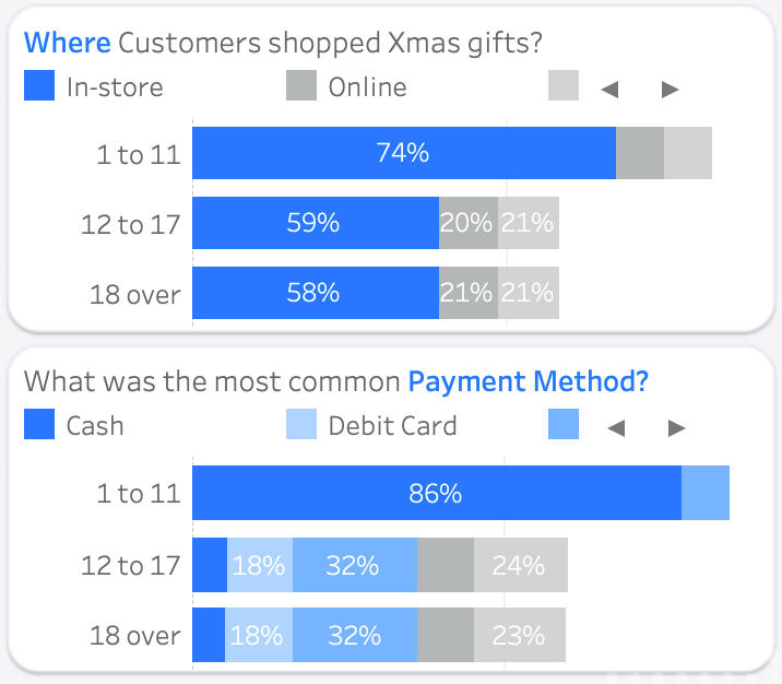 This is understandable as kids often prefer the hands-on experience of selecting gifts.Cash was the preferred payment method for Kid purchases, while Teens (ages 12–17) and Adults (ages 18 and over) leaned towards credit card, and cash was their least preferred payment method.